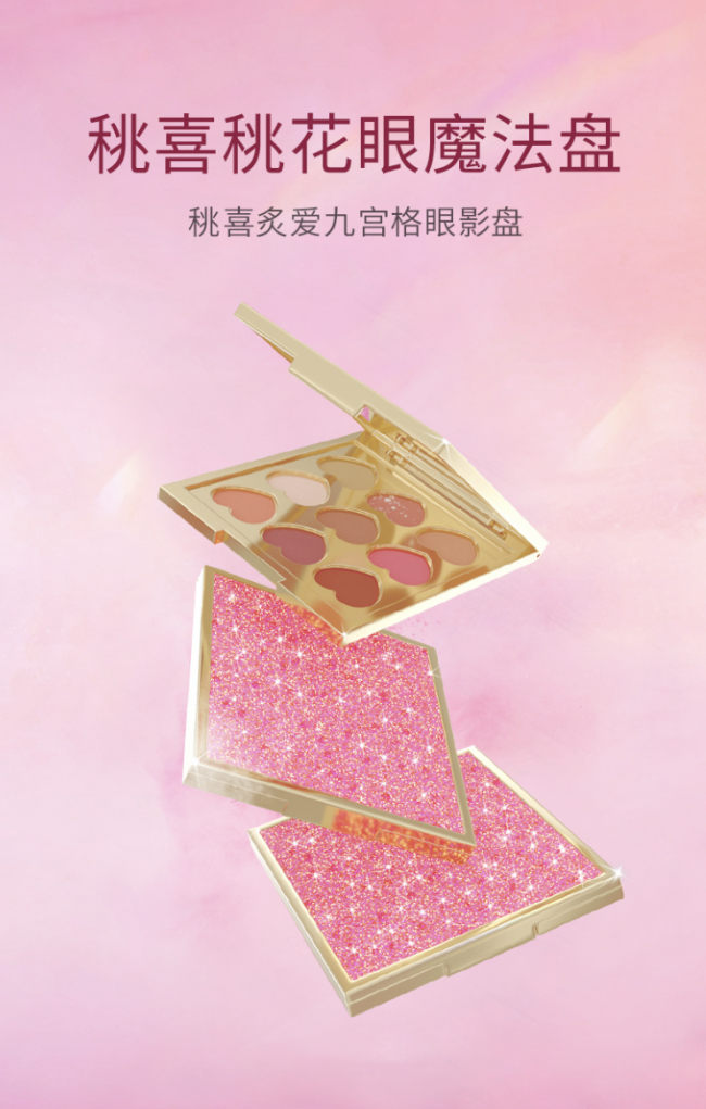 眼影是眼妆中最为重要的产品,也是每个“䄻喜女孩”必备的彩妆单品之一。䄻喜挚爱九宫格眼影盘采用“心形外观”+“9种䄻色”设计,随心选择,“䄻色”满满!