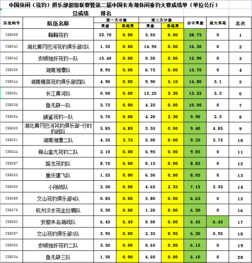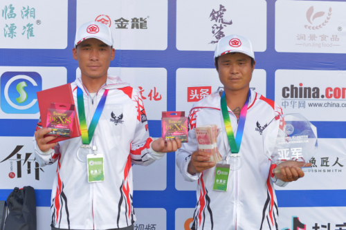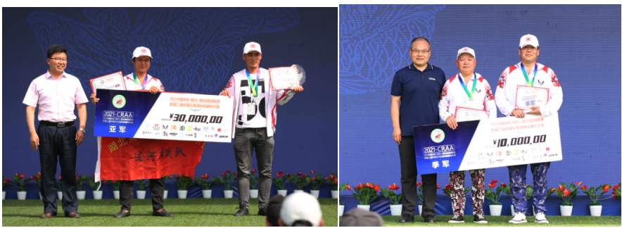 100组国内优秀筏钓高手,通过两天两场共计16个小时的鏖战,最终由来自湖南常德鞠鞠筏钓战队的燕红蕊和鞠国平,凭借合理的战术安排和高超的钓技,以总重28.75kg大幅领先的优势拔得头筹,喜提10万元现金大奖。湖北黄冈巴河筏钓俱乐部过河卒二队、安顺独好筏钓一队同样表现优秀,分别获得本次大赛的亚军、季军及丰厚的现金大奖;