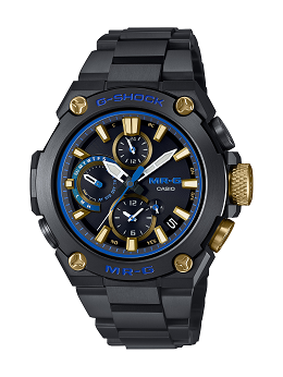 MR-G“勝色”系列整体设计采用“和”主题,兼顾强韧与华丽,表圈采用带有重金属结晶感的钛金属,并利用钛加热处理使之在表面形成独特的结晶花纹,用以表现日本刀刀身和刀刃交界处的银砂花纹。设计样纹来自于“毗沙门天王”甲胄中的“毗沙门龟甲”,增强美感的同时也体现出日本古代勇武之人的威严感。该系列表款均以太阳能为动力,配备高亮度LED照明以及六局电波,并带有指针位置自动修正功能,支持手机蓝牙连接,可显示27城市的世界时间。其表外观采用人造蓝宝石玻璃镜面,使整体带有简洁华丽的质感,兼顾舒适与耐久性。