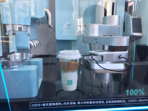 据悉:这台智能机器人是由上海氦豚机器人科技有限公司研发的——“COFE+机器人咖啡亭”,平均 50秒-1分钟就能制作1杯饮品,能提供两种咖啡豆、两种奶源、两种杯型和冷/热/冰三种温度选择,消费者可以自由选配浓度/温度/甜度/冰量以及粉粒浆酱辅料的克重,不仅能现磨咖啡(美式、拿铁、卡布奇诺、每周推出应季新品等)还能制作西式奶茶、日式抹茶、巧克力饮品、乳饮 ,50 多种口味。