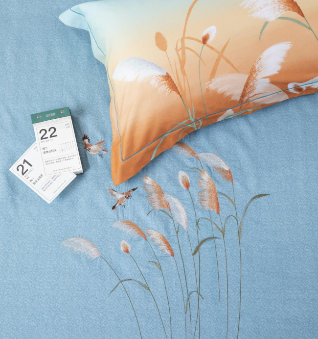 2021年远梦秋冬新品磨毛四件套-纯棉四季绒之秋色苇岸,将一幅精美的暖秋艺术画作完美呈现于我们眼前,唤活空间温暖舒适氛围。其灵感来源于每到秋天,湖边一片又一片的芦苇荡就大面积开出绒绒的浪漫花朵,芦苇花随风飘荡,产生一种轻柔的美好令人温暖着迷。