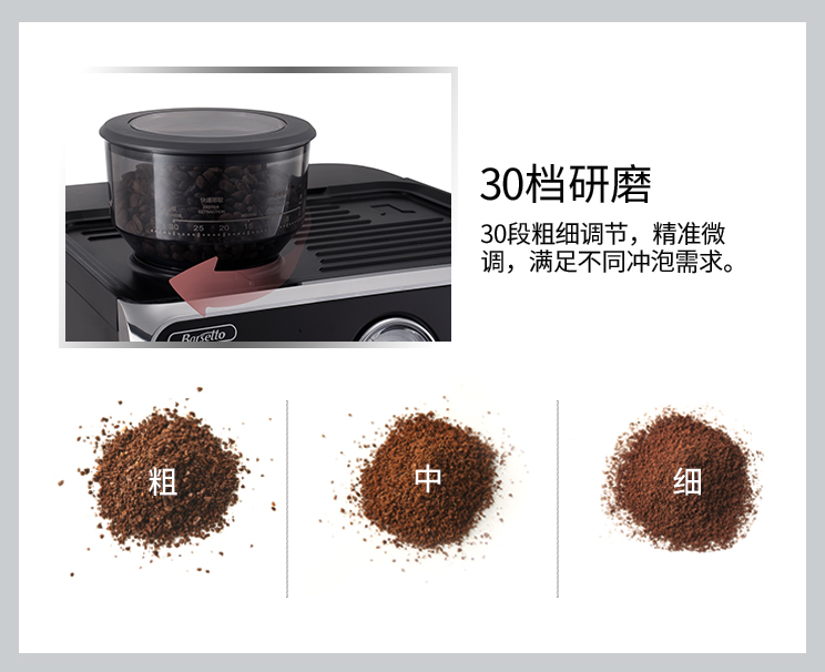 而且咖啡粉研磨过程简单并十分好上手,免手持的研磨设计能有帮助解放双手,省心省力;不锈钢的圆锥磨刀器研磨出的咖啡粉粗细均匀且研磨热量低;拥有30档咖啡粉末研磨度,用户可根据喜好自行调节研磨粗细程度,满足不同的冲泡需求;另外它还有防静电功能,即使研磨细粉也不会出现飞粉、残粉、积粉等情况,咖啡机小白也能操作的游刃有余。