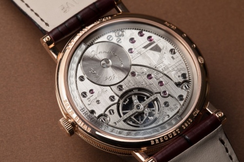 宝玑Classique经典系列5365超薄陀飞轮220周年纪念腕表搭载一枚位于4点钟和6点钟之间的60秒陀飞轮,其中一个转轴用于显示秒数,而上桥板由蓝钢制成。陀飞轮上方镌刻有“Brevet No 157”字样,指代宝玑先生于220年前所获得的陀飞轮专利编号。该款时计作品对陀飞轮发明的致敬同样体现于表背,发条盒上镌刻有“Anniversaire 1801-2021”字样,且每枚腕表均手工镌刻有独立编号和宝玑签名,在机芯右侧,则忠实复现了宝玑先生于1801年提交陀飞轮调校装置专利申请时所使用的水彩底片。