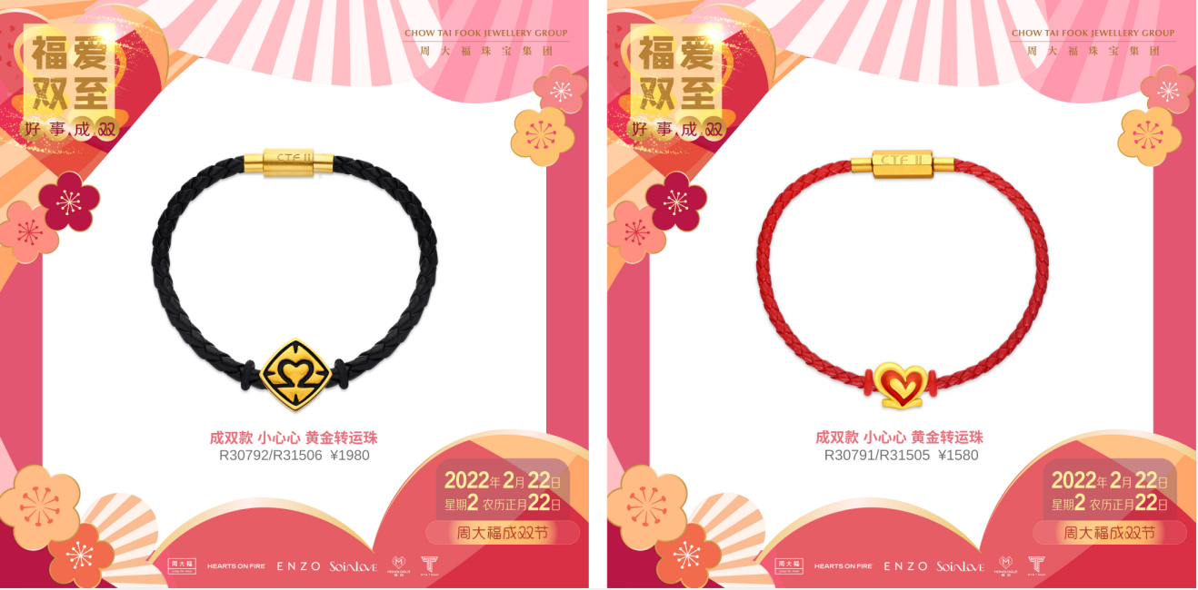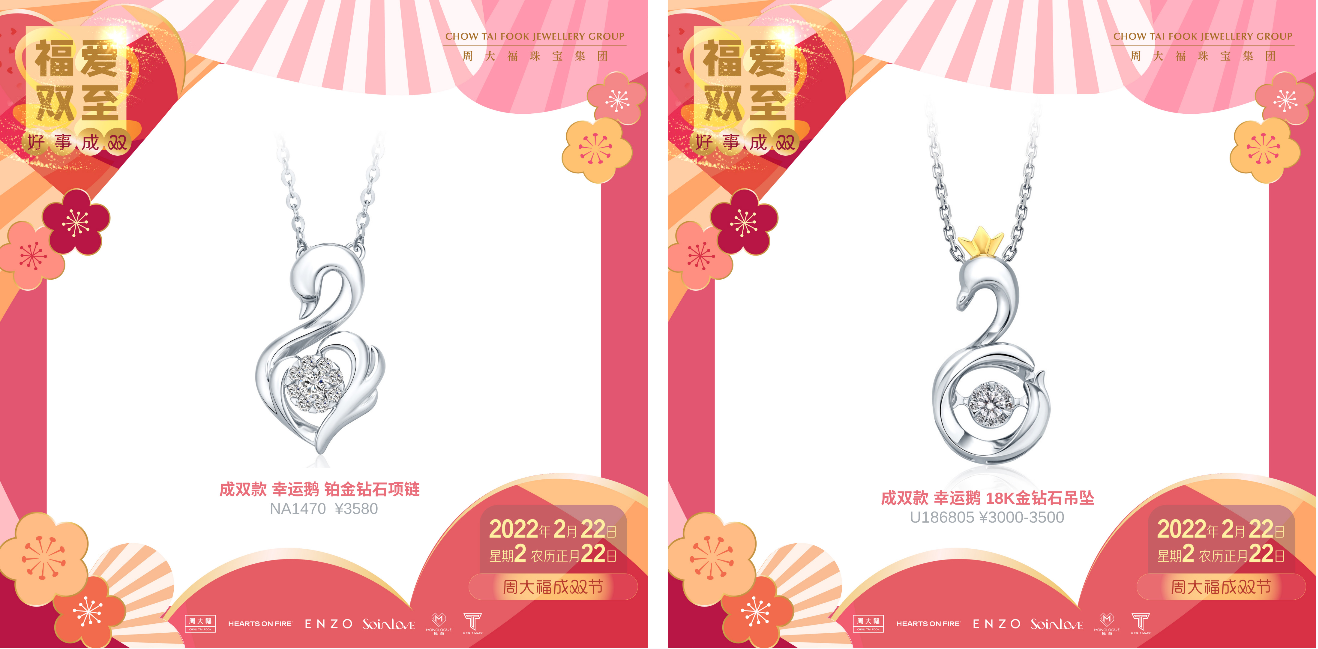 “在天愿作比翼鸟,在地愿为连理枝。”在每一位国民心中“双”都是和美的代名词,成双节中的九个“2”也传达着万事皆可成双的美好,双倍心意与双倍惠礼也同样酝酿出多重满足感与幸福感。在百载难逢的节日里勇敢说爱,愿未来每一个周大福专属节日,都能再次与你们共度!